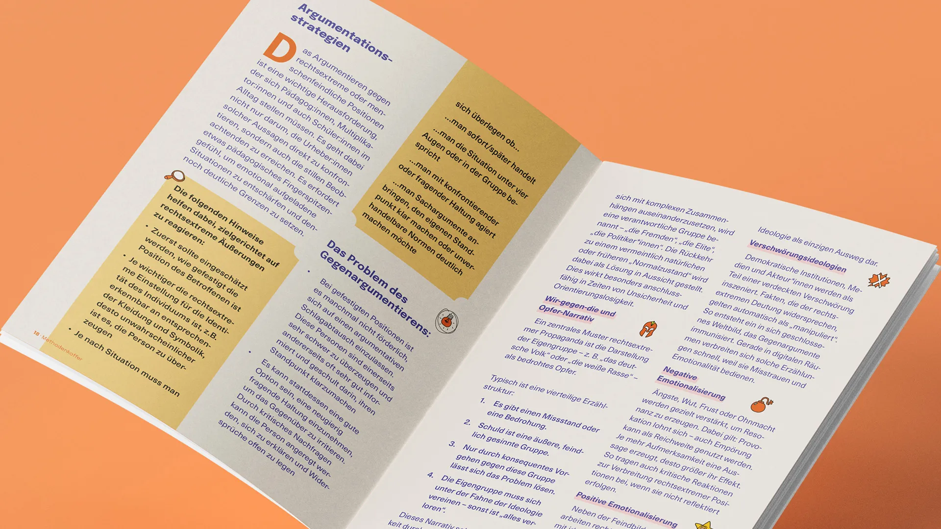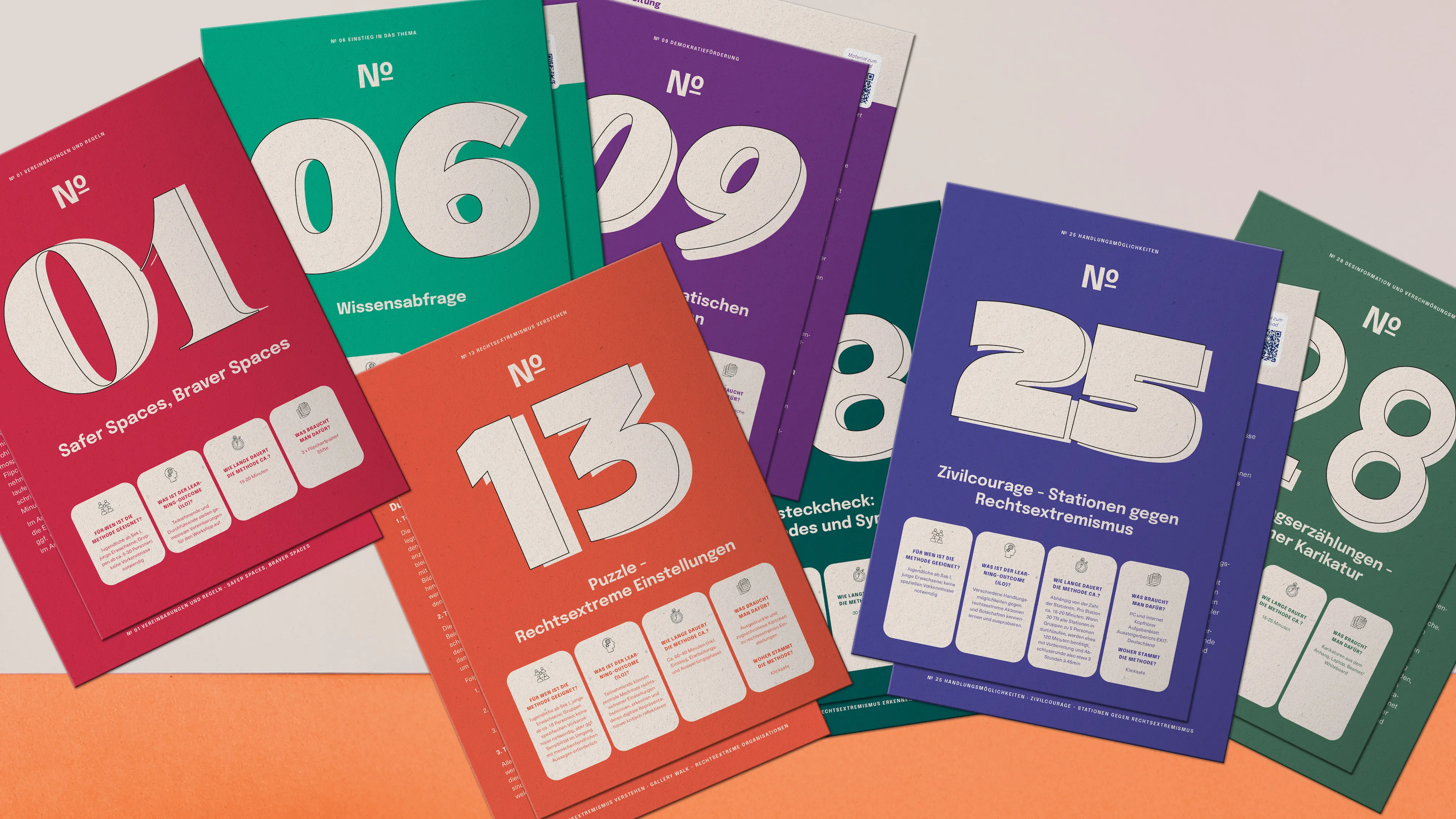 Aus klarer Struktur wurde visuelle Vielfalt: Jedes Oberthema bekam eine eigene Farbe und eine prägnante Schrift – ein System, das Orientierung schafft und gleichzeitig Freude am Entdecken weckt. Die Illustrationen erzählen von Austausch, Gemeinschaft und Offenheit und machen komplexe Themen emotional zugänglich. So wurde der Methodenkoffer zu einem Werkzeug, das Lernen spürbar und lebendig macht.